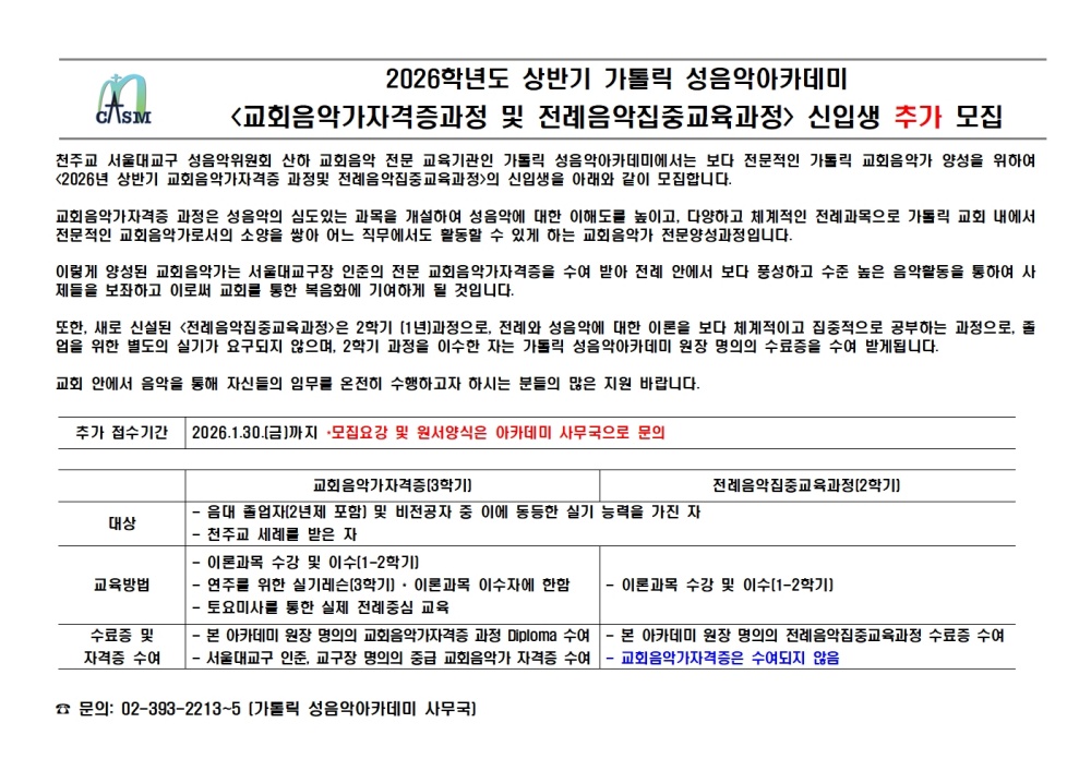 [모집] 2026학년도 상반기 <교회음악가자격증 과정 및 전례음악집중교육과정> 신입생 추가 모집