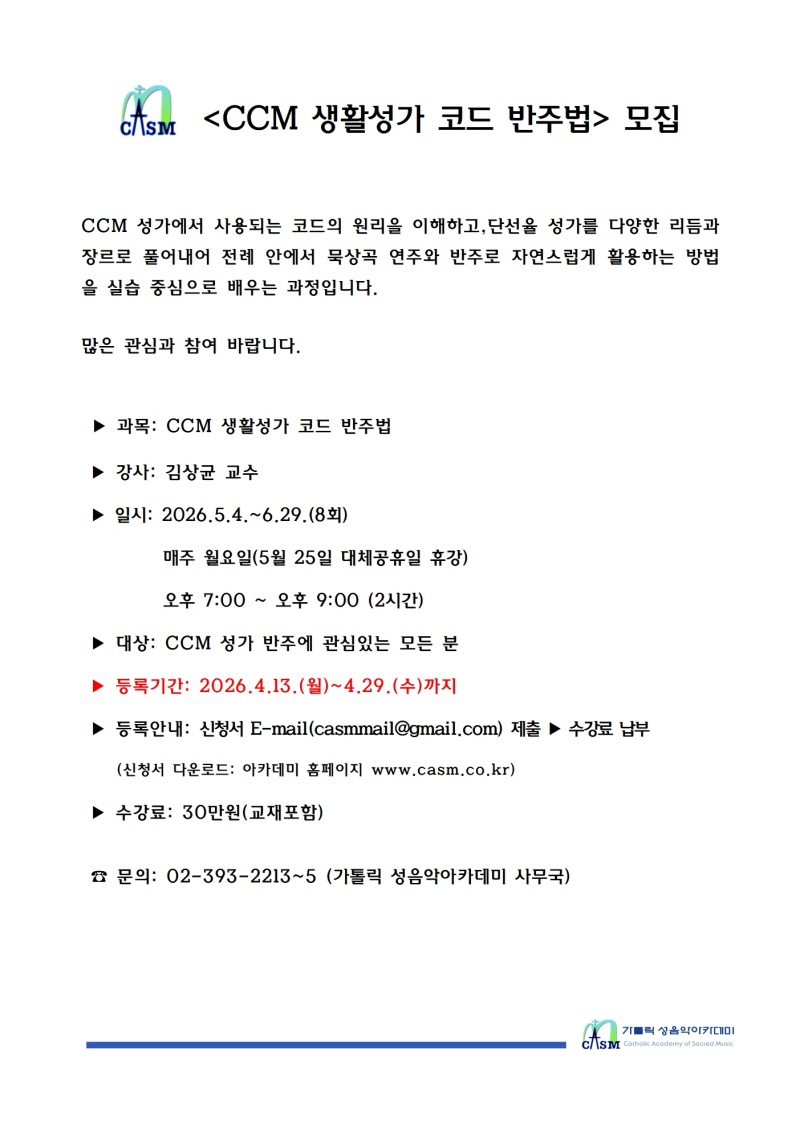 [모집] CCM 생활성가 코드 반주법 모집 아카데미관리자 0 106 04.08 14:37 2026.04.08 14:37 양식아카20-12 성음악아카데미 특강 참가 신청서2026 CCM 생활성가 코드 반주법.hwp (60.5K) + 9 2026.04.08 14:37 양식아카20-12 성음악아카데미 특강 참가 신청서2026 CCM 생활성가 코드 반주법.pdf (130.0K) + 14